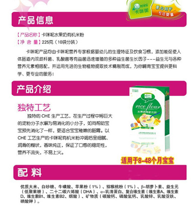 卡咪呢有機米粉系列是專為中國寶寶設(shè)計的營養(yǎng)輔食,選用有機大米,科學(xué)搭配維生素AD等維生素,還特別添加;撬、DHA、AA等有助智力發(fā)育的營養(yǎng)成分,富含15種營養(yǎng)素,F(xiàn)上?ㄟ淠啬笅胗闷酚邢薰久嫦蛉珖瞻资袌鰠^(qū)域誠招卡咪呢有機米粉代理商。